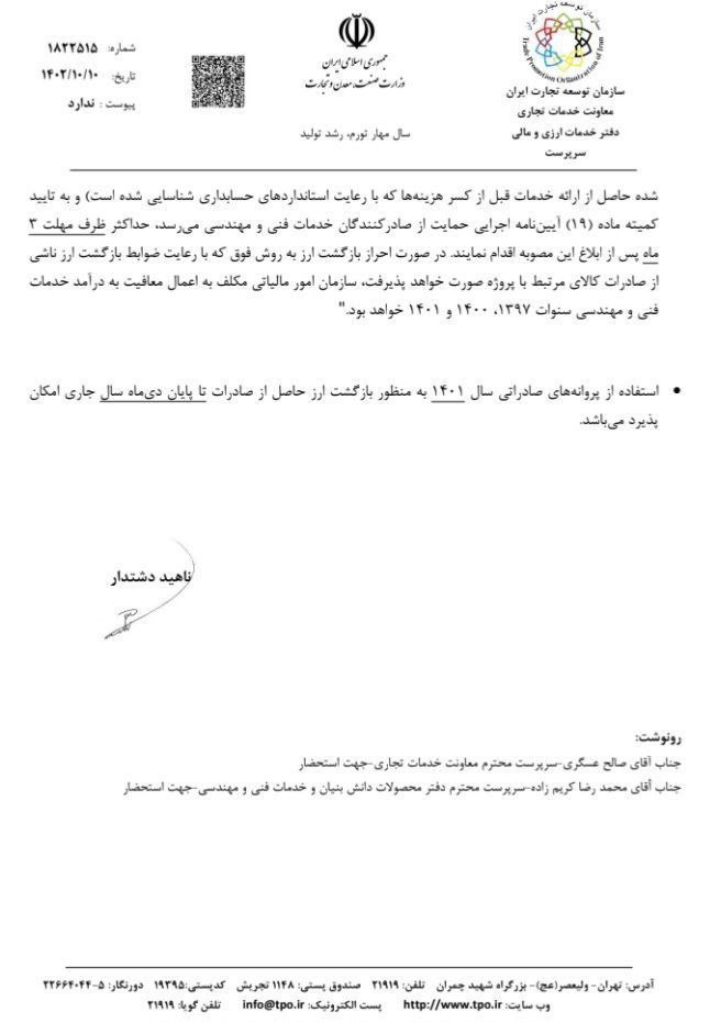 3- تمدید عدم اعمال محدودیت‌های تجاری برای صادرکنندگان مشمول استثنائات تا پایان سال 1402